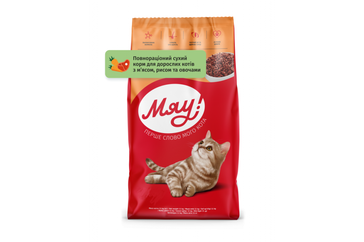 Повнораціонний сухий корм Мяу для дорослих котів з м'ясом, рисом та овочами