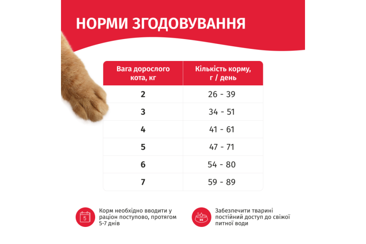 Енергетична цінність (калорійність) 100 g (г) корму: 1479,72 kJ (кДж) (354 kcal (ккал).