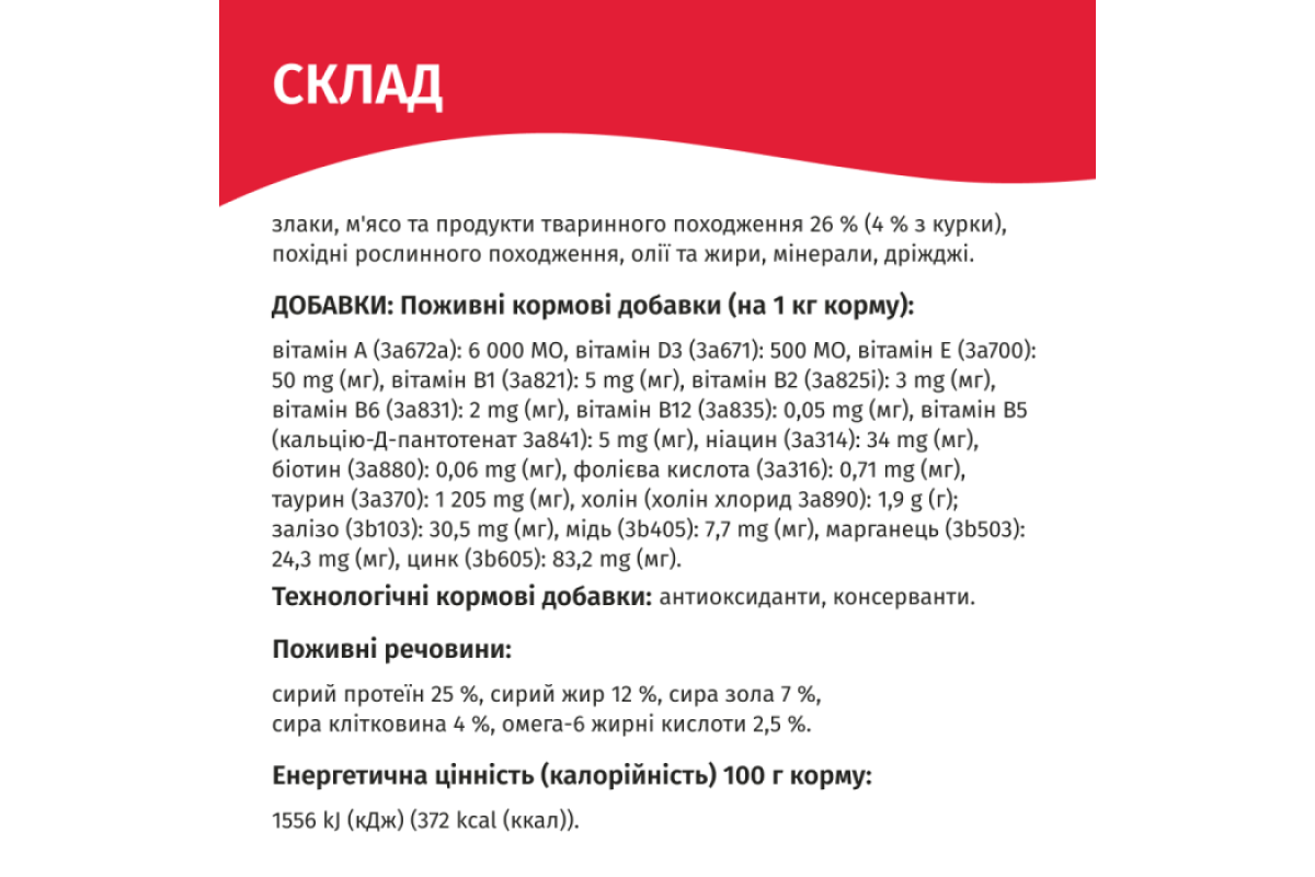 Добавки (на 1 kg (кг) корму): Вітамін А (3a672a): 6 000 МО, вітамін D 3 (3a671): 500 МО, вітамін Е (3a700): 50 mg (мг), вітамін К 3 (3a710): 0,4 mg (мг), вітамін В 1 (3a821): 5,0 mg (мг), вітамін В 2 (рибофлавін): 3,0 mg (мг), D-пантотенат кальцію (3a841): 5,0 mg (мг), ніацин (3а314): 34,0 mg (мг), вітамін В 6 (3a831): 2,0 mg (мг), фолієва кислота (3a316): 0,71 mg (мг), вітамін В 12 (ціанокобаламін): 0,153 mg (мг), біотин (3a880): 0,051 mg (мг), таурин(3a370): 1 205 mg (мг); мікроелементи: сульфат міді пентагідрат (3b405): 30,3 mg (мг), цинк сульфат гептагідрат (3b604): 373,1 mg (мг), сульфат заліза моногідрат (3b103): 82,3 mg (мг), сульфат марганцю моногідрат (3b503): 76,4 mg (мг).