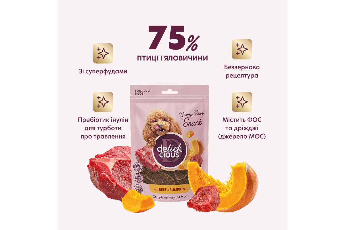 Сушені снекиDELICKCIOUS – з яловичиною і гарбузом для собак, 0,08 кг