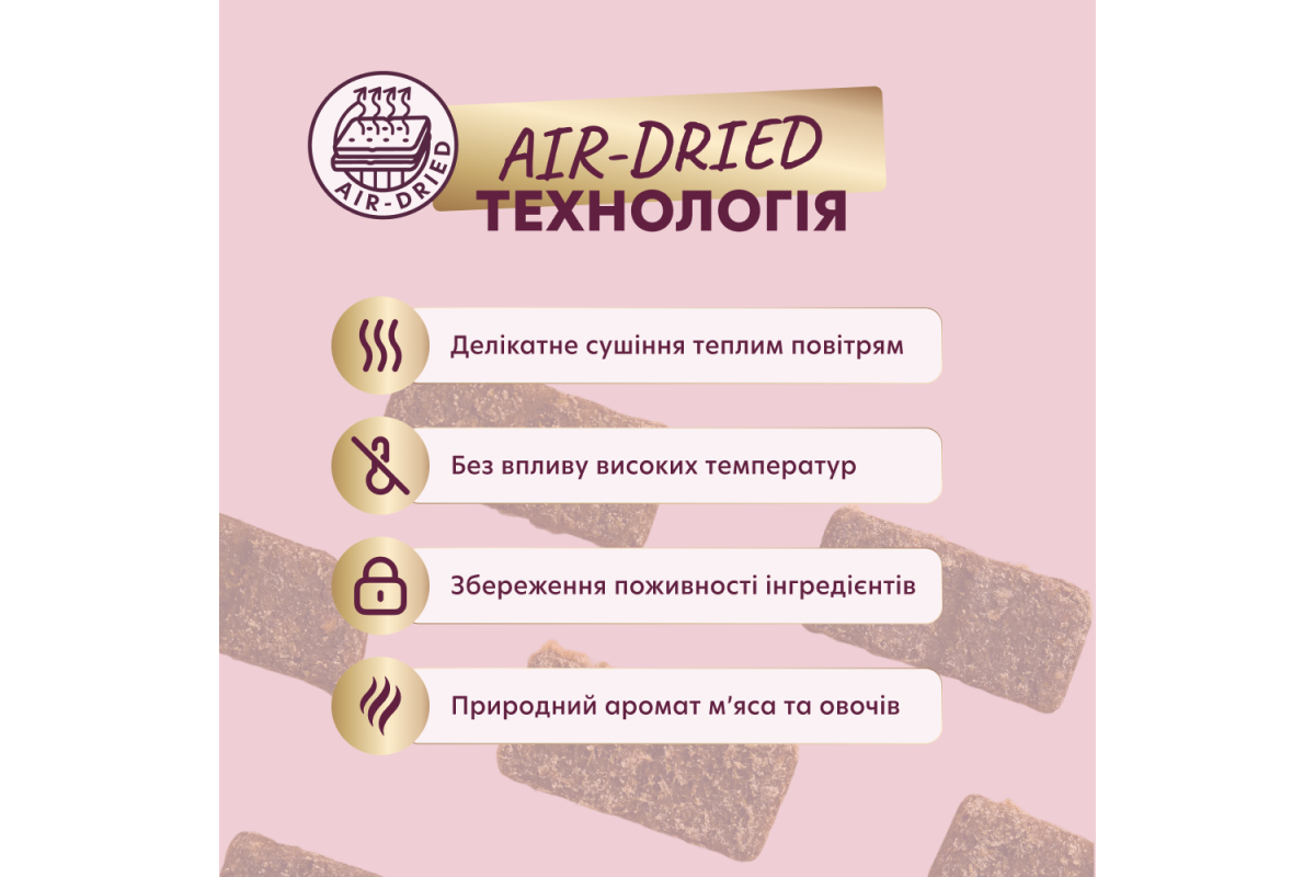 Створені за технологією air-dried — делікатного сушіння повітрям, яка зберігає поживність, вітаміни та природний смак справжнього м’яса, що приваблює навіть найвибагливіших улюбленців. Ідеальний формат для балування: пом'якшена текстура снеків підійде для смакування різними породами собак. Смаколик стане чудовим доповненням для заохочень улюбленця, а також для балувань під час прогулянок чи спільних моментів. Не просто їжа, а вау-лизь!
