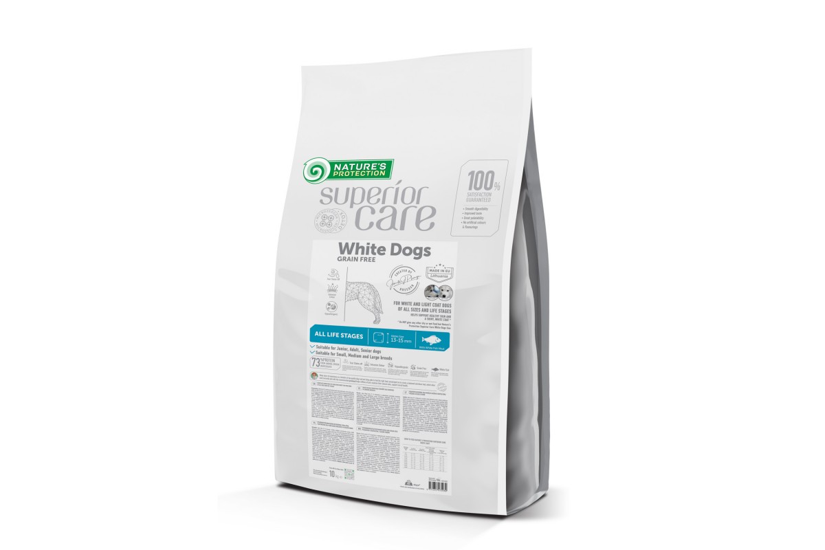 Сухий корм Nature's Protection Superior Care з білою рибою для собак усіх розмірів і на всіх етапах життя – це повноцінний і збалансований корм Супер Преміум сегменту з джерелом білка та сировини найвищої якості, що допомагає боротися з коричневими плямами від сліз та підтримувати шкіру й шерсть здоровими. Розмір гранул – дуже універсальний: 13-15 мм, що робить його придатним для собак будь-якого розміру та віку. Підходить для великих порід, які надають перевагу дрібному корму, та для молодих собак, які полюбляють їсти більший корм. Містить формулу Tear Stains off – ретельно підібраний комплекс амінокислот і добре збалансованих інгредієнтів у складі. Корм не містить зернових і підходить для тварин з чутливою травною системою, оскільки не обтяжує травний тракт. Повноцінний склад сухого корму не тільки забезпечить вашого улюбленця всіма необхідними поживними речовинами, але й гарантує ідеальну засвоюваність та смакові якості.
