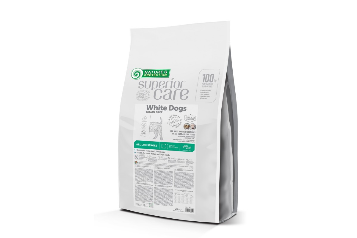 Сухий беззерновий корм для домашніх тварин Nature's Protection Superior Care з комахами для собак усіх розмірів і життєвих стадій із білою та світлою шерстю відомий своїм добре збалансованим складом і сировиною. Цей розмір кормових гранул є дуже універсальним. Розміром 13-15 мм підходить для собак будь-якого розміру та віку. Він ідеально підходить для великих порід, які віддають перевагу їденню дрібних гранул, дозволяючи їм їсти більше за один раз і покращуючи свою систему травлення. Для молодих собак, які люблять більші крупки, це сприятливий вибір, щоб допомогти їм навчитися правильно жувати та ковтати корм. Жування гранул може допомогти собаці зберегти здоров’я зубів. Повнораціонний сухий корм для собак бореться з коричневими плямами від сліз і зберігає здоров'я шкіри та шерсті.