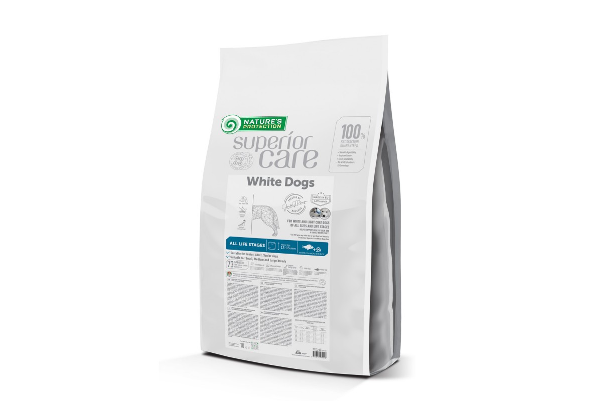 Сухий корм Nature's Protection Superior Care з білою рибою для собак усіх розмірів та на всіх етапах життя – це повноцінний та збалансований корм Супер Преміум сегменту з джерелом білка та сировини найвищої якості, що допомагає боротися з коричневими плямами від сліз та підтримувати шкіру та шерсть здоровими. Розмір гранул - дуже універсальний: 13-15 мм, що робить його придатним для собак будь-якого розміру та віку. Підходить для великих порід, які віддають перевагу дрібному корму, і для молодих собак, які люблять їсти більший корм. Містить формулу Tear Stains off – ретельно підібраний комплекс амінокислот та добре збалансованих інгредієнтів у складі. Корм містить білий рис, який забезпечує енергією, не обтяжуючи травну систему та допомагає підтримувати загальну функцію кишечника. Повноцінний склад сухого корму не тільки забезпечить вашого вихованця всіма необхідними поживними речовинами, але й гарантує ідеальну засвоюваність та смакові якості.