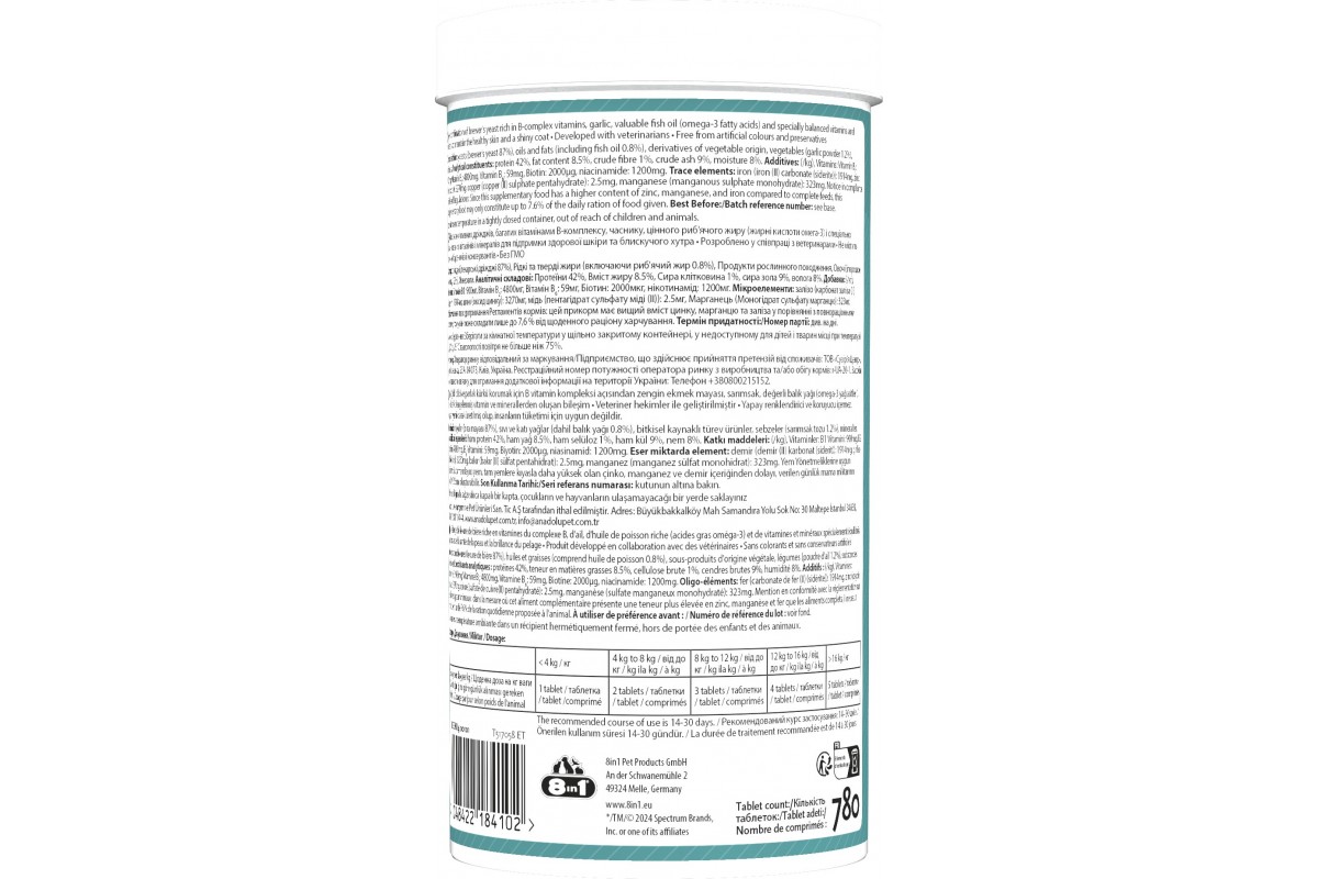 Вітаміни 8in1 Excel Brewers Yeast для собак та котів, пивні дріжджі з часником, для шкіри та шерсті 780шт