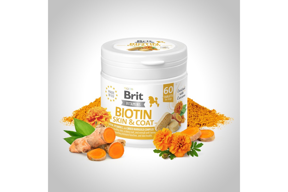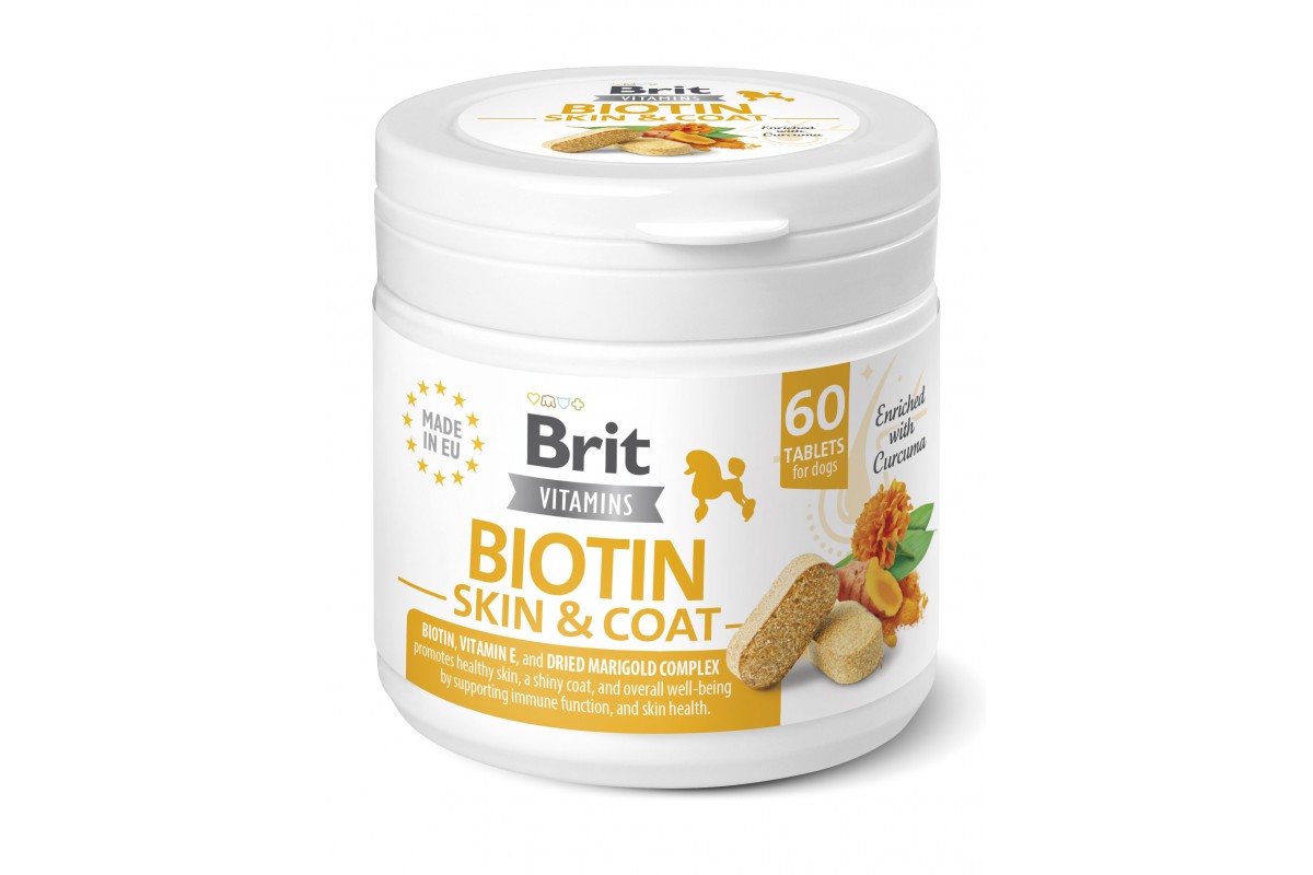 Brit Vitamins Biotin Skin & Coat – вітамінна харчова добавка для собак, яка допомагає лікувати алергію, шкірні захворювання, покращує стан шкіри та якість шерсті.