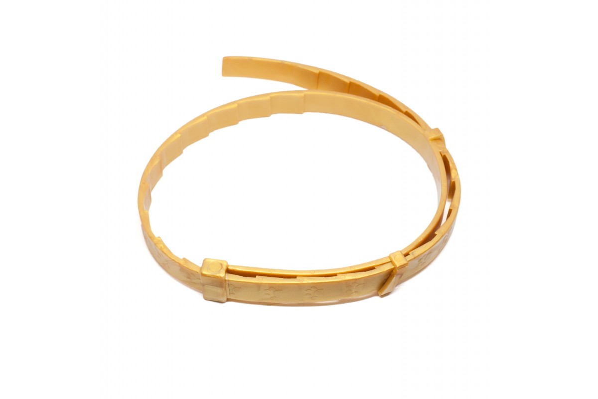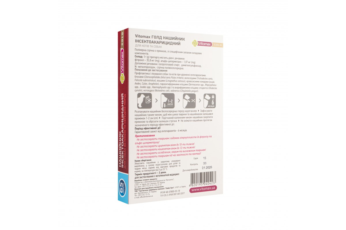 Нашийник Gold являє собою вузьку полімерну стрічку золотистого кольору, з нанесеним логотипом Vitomax, візерунком та петлями для фіксації. Призначений для боротьби з блохами, кліщами, вошами та волосоїдами у собак.