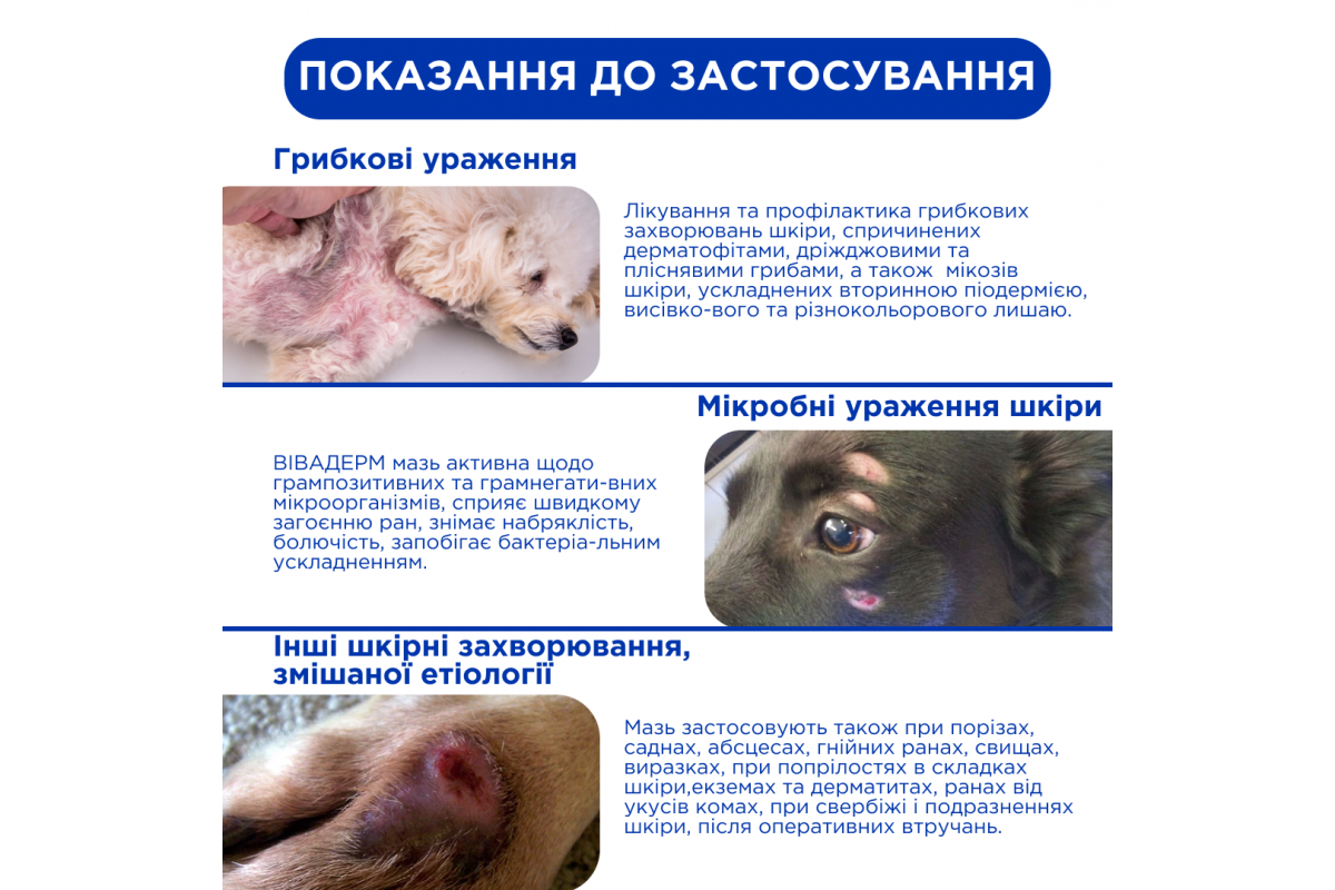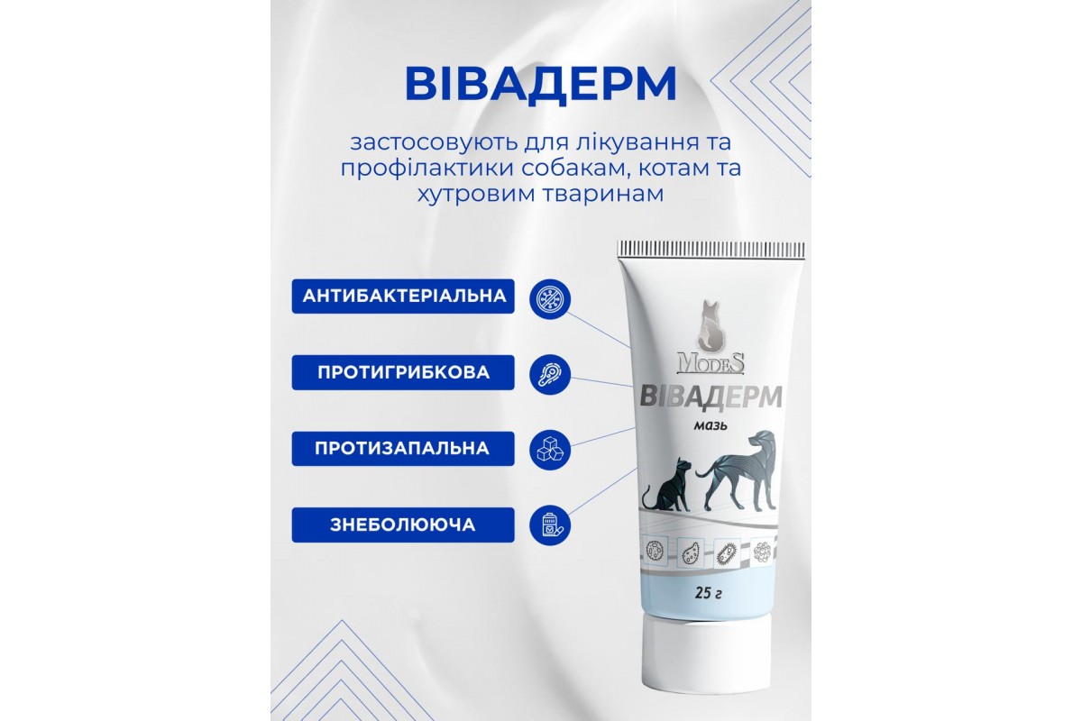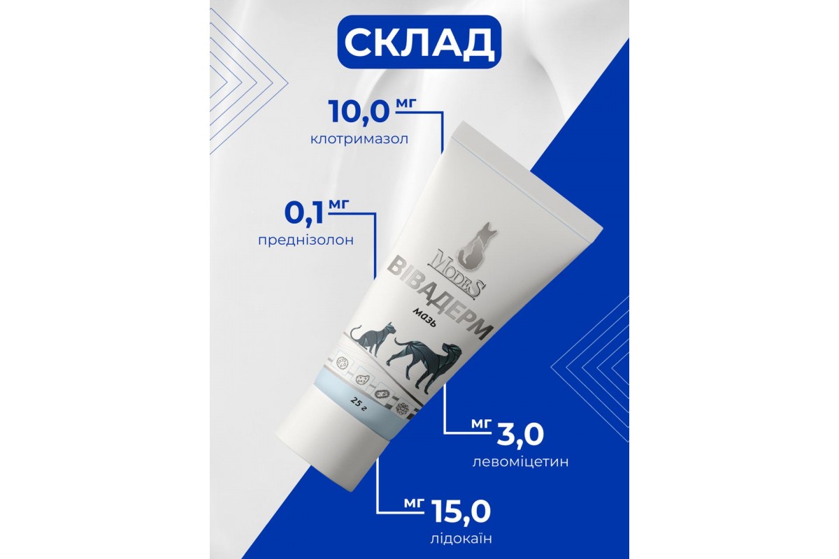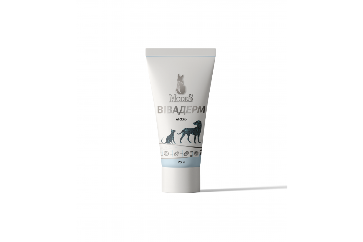 ВІВАДЕРМ мазь – комбінований препарат для собак, котів та хутрових тварин, який чинить репаративну, антимікробну, протизапальну та знеболювальну дії, фармакологічна дія якого зумовлена чотирма активними речовинами: клотримазолом, преднізолоном, левоміцетином та лідокаїну гідрохлоридом. ВІВАДЕРМ мазь активна щодо грампозитивних та грамнегативних мікроорганізмів, сприяє швидкому загоєнню ран у тварин, ефективно знімає набряклість, болючість, запобігає бактеріальним ускладненням.