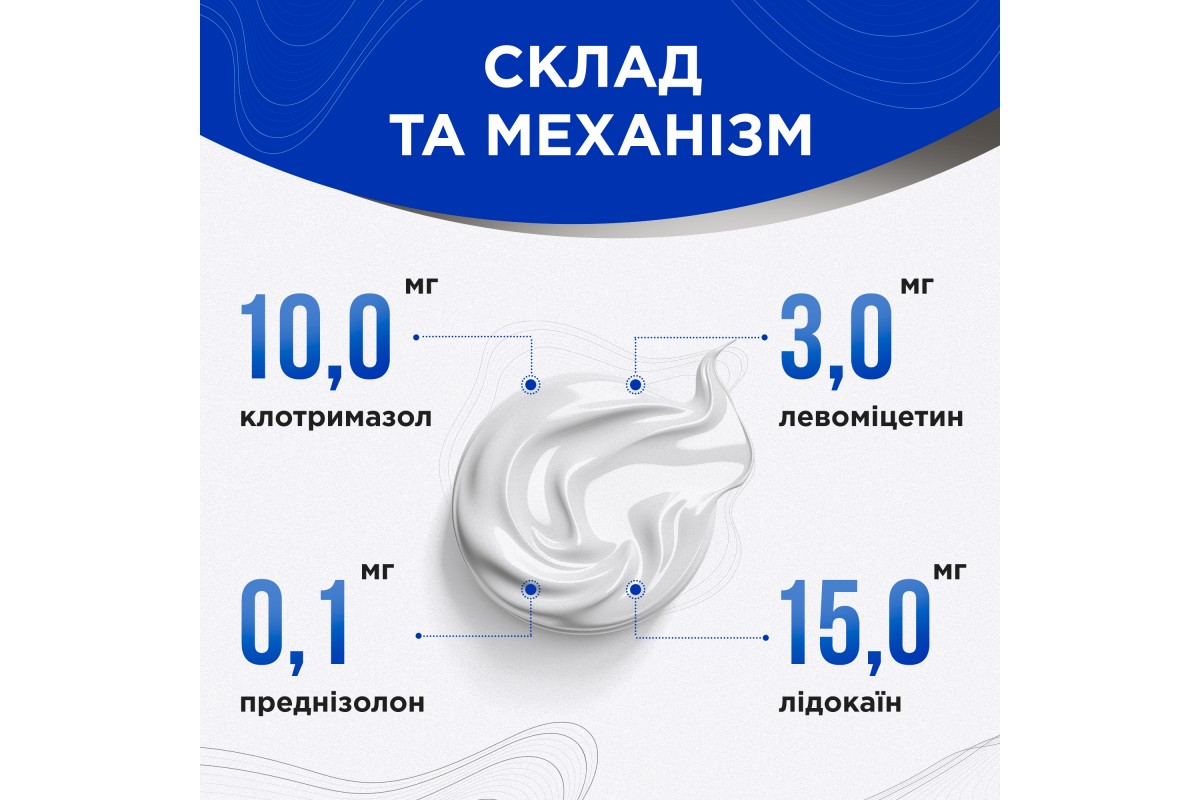 клотримазол – 10,0; преднізолон – 0,1; левоміцетин – 3,0; лідокаїну гідрохлорид – 15,0.